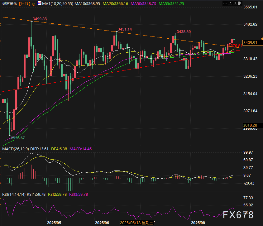 周四(8月28日)美元指数跌0.33%,跌破上升趋势线收在97.85,而黄金周四收涨0.58%,报3416.88美元/盎司。周五(8月29日)亚欧时段,美元指数小幅反弹,现货黄金小幅回落0.2%,目前交投于3410附近,市场押注美联储9月启动降息——其对美元、股市及黄金汇市等有重要影响。