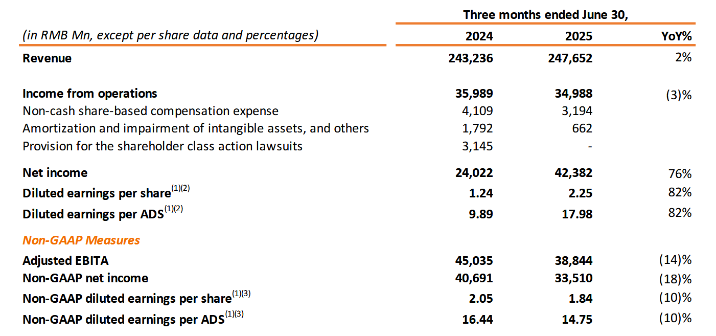 截至2025年6月30日止的季度收入为人民币2476.52亿元(345.71亿美元),同比增长2%。若不考虑高鑫零售和银泰的已处置业务的收入,同口径收入同比增长将为10%。